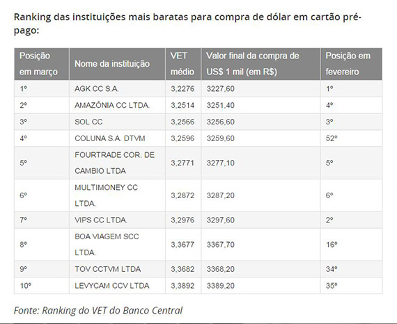 Essa pesquisa pode ser feita sem grandes complicações no site do Banco Central, com a ferramenta Ranking do VET, que mostra as instituições de câmbio que praticam o Valor Efetivo Total (VET) mais vantajoso, tanto para dólares quanto para outras moedas.