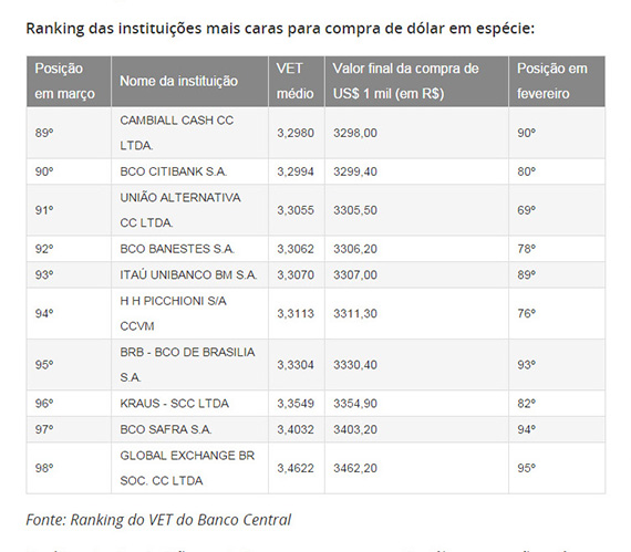 Os dados mais recentes do ranking do BC, referentes a março, mostram que o VET pode ter uma diferença de até 20 centavos entre a instituição mais barata e a mais cara na compra do dólar em espécie. Para uma conversão de 1.000 reais, por exemplo, isso representa uma diferença de 301,30 reais.