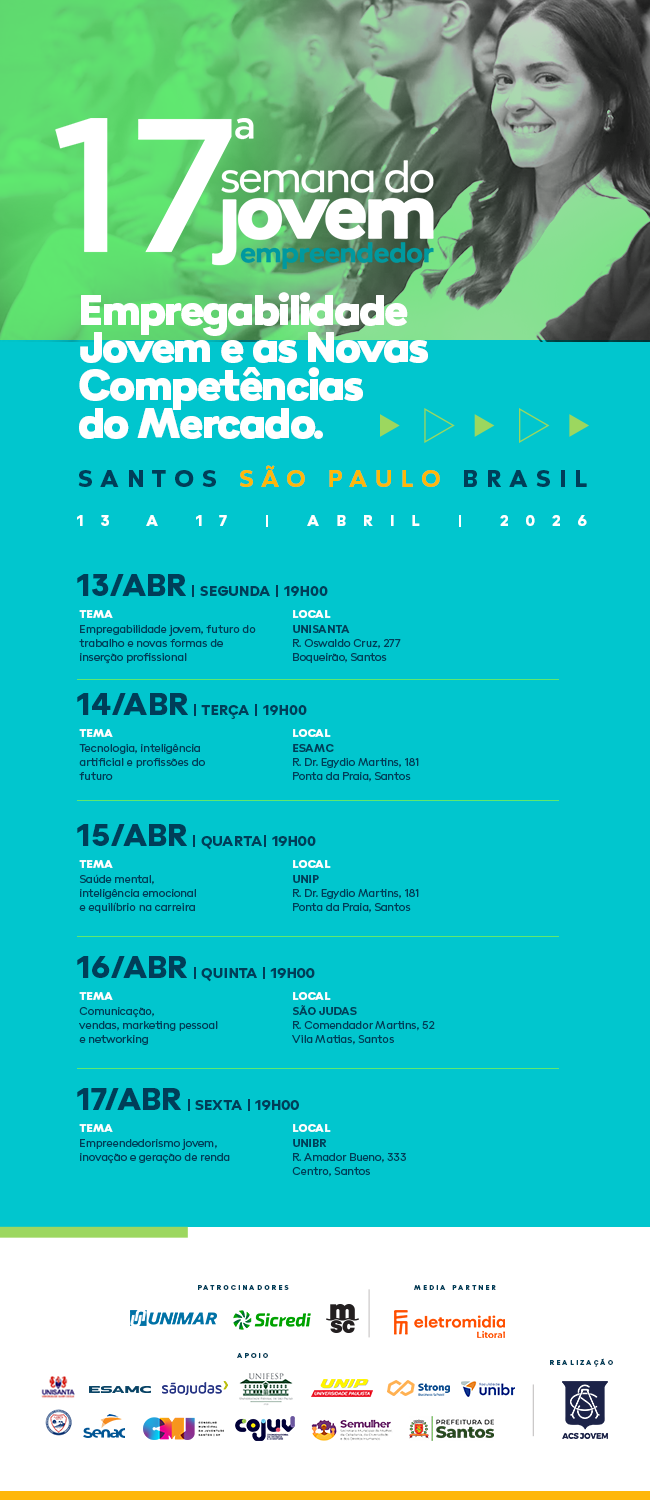 A Associação Comercial de Santos (ACS), por meio da ACS Jovem, promove a 17ª edição da Semana do Jovem Empreendedor a partir desta segunda-feira (13) até sexta-feira (17), às 19 horas, nas universidades locais. A abertura será na Unisanta (Rua Oswaldo Cruz, 277, Boqueirão) com o tema Empregabilidade jovem, futuro do trabalho e novas formas de inserção profissional.