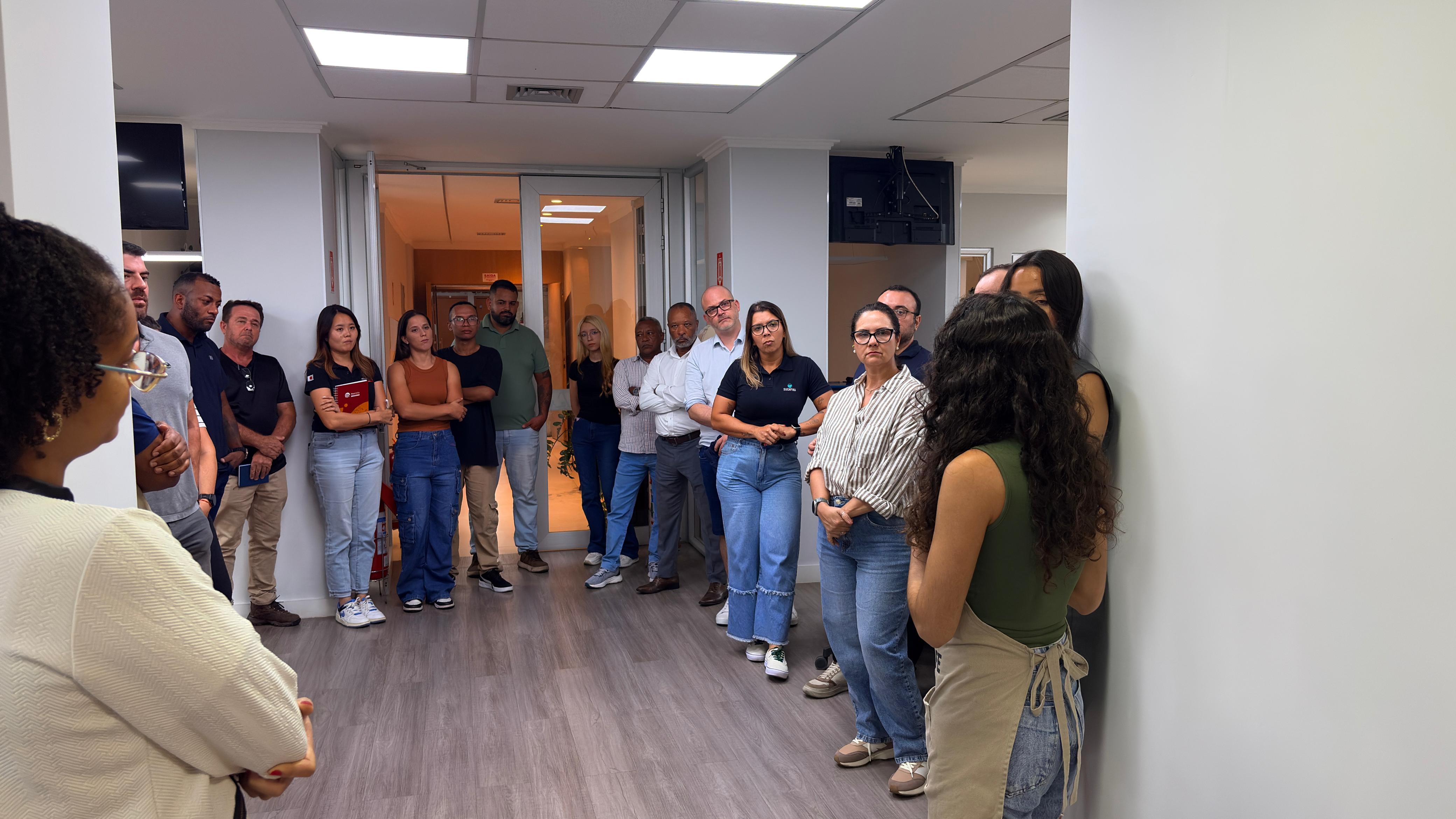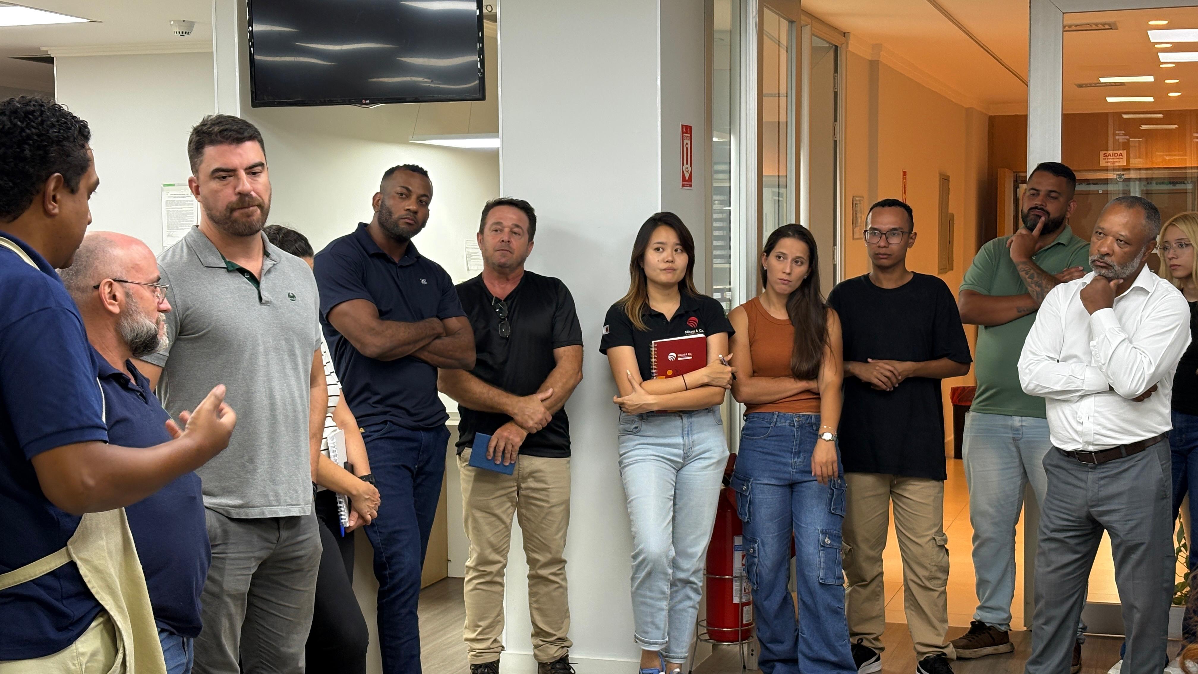 A atividade, realizada nesta segunda-feira (23), contou com a participação do gerente de qualidade, Gabriel Barbara, além das alunas do curso que atuam na empresa, a auxiliar de classificação Isadora Castro e Maria Valéria.