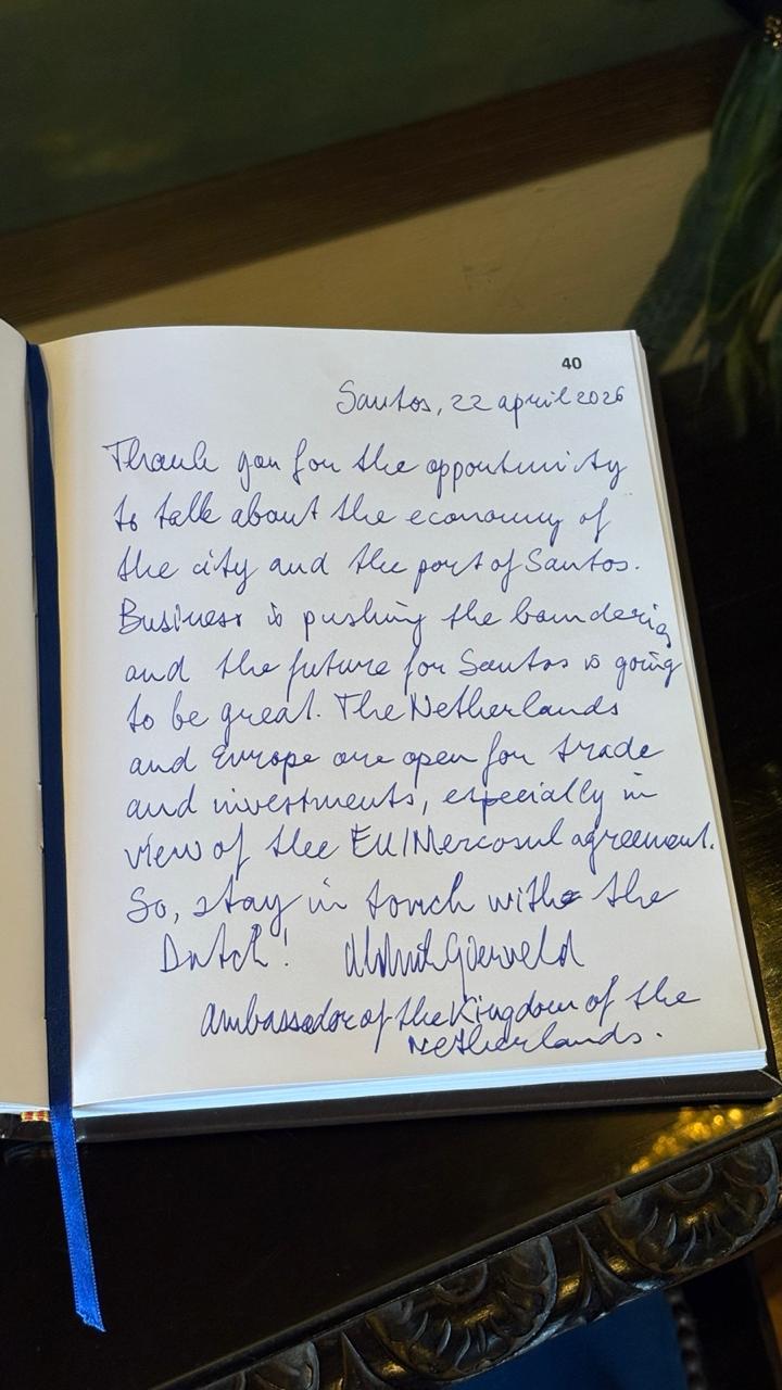 Recebida pelo presidente da ACS, Mauro Sammarco, a delegação participou de uma reunião institucional marcada pelo diálogo sobre temas estratégicos ligados ao Porto de Santos, maior complexo portuário da América Latina. Durante o encontro, foram discutidas oportunidades de cooperação internacional, o fortalecimento das relações comerciais entre Brasil e Países Baixos, além do papel do porto santista como eixo logístico fundamental para o comércio exterior e para a competitividade global.