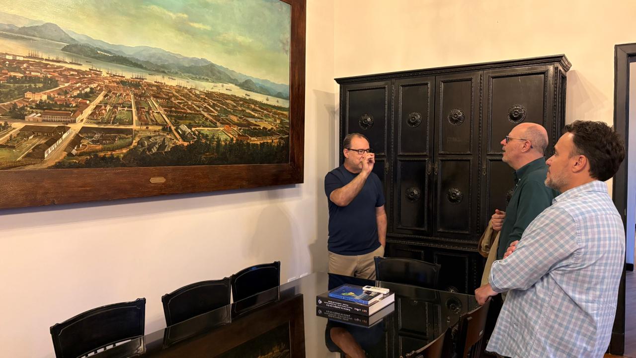 O visitante também apreciou as obras de Benedito Calixto, expostas na sala da Presidência, que retratam vistas do Porto de Santos em meados de 1890 e destacam a relevância histórica da região.